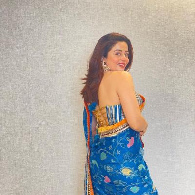 निळ्या रंगाच्या साडीत नेहा पेंडसे खूप सुंदर दिसते आहे.
