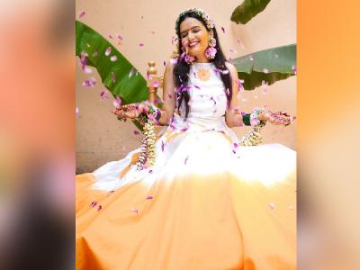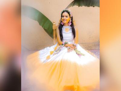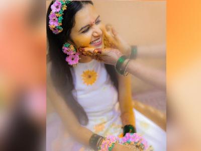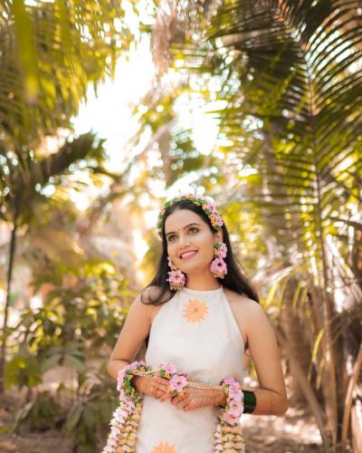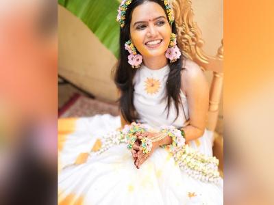 क्षितीजाने या हळदीसाठी खास पिवळ्या रंगाचा डिझायनर ड्रेस परिधान केला होता. सोबतच फुलांची ज्वेलरी सुद्धा घातली होती.