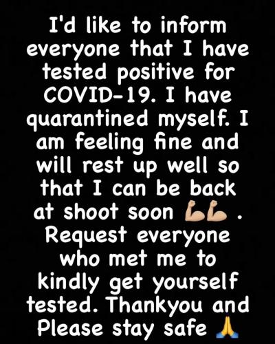 रकुल प्रीत सिंगने सोशल मीडियावर पोस्ट शेअर केली आहे की, मला कोरोनाची लागण झाली असून माझी प्रकृती चांगली आहे. माझ्या संपर्कात आलेल्या सगळ्यांनी कोरोनाची टेस्ट करून घ्यावी...