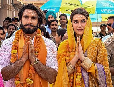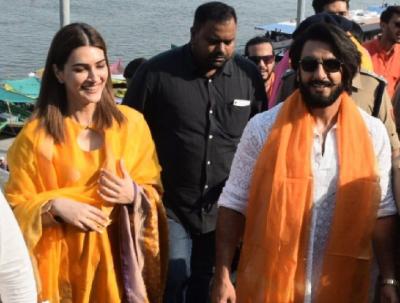 रणवीर आणि क्रिती यांनी मनीष मल्होत्रासोबत काशी विश्वनाथ मंदिरात पूजा केली. यावेळी क्रितीने पारंपारिक पिवळ्या रंगाचा ड्रेस परिधान केल्याचं दिसून आले.