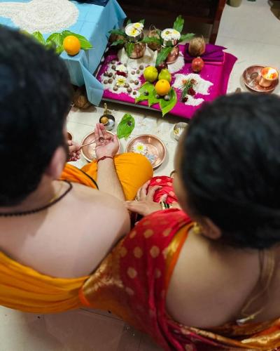 या पूजेसाठी मुग्धा लाल रंगाची साडी नेसली आहे तर प्रथमेशने पितांबर परिधान केला आहे.
