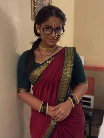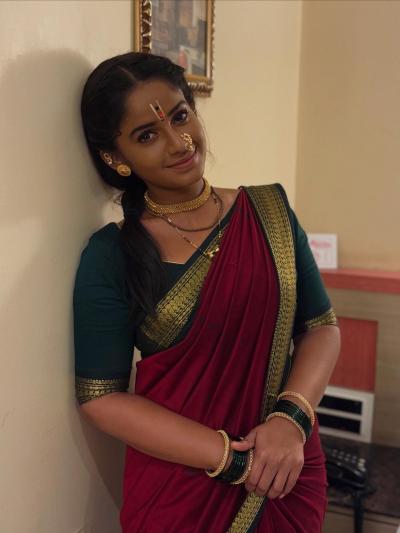 प्राप्ती रेडकर वारीमध्ये सावलीच्या गेटअपमध्ये पाहायला मिळाली. यावेळी तिने मरुन रंगाची साडी नेसली होती.