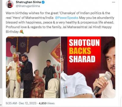 भारतीय राजकारणातील महान 'चाणक्य' आणि महाराष्ट्र/भारताचे खरे 'नायक' शरद पवार यांना वाढदिवसाच्या हार्दिक शुभेच्छा, असे म्हणत अभिनेता शत्रुघ्न सिन्हा यांनी शरद पवारांना वाढदिवसाच्या शुभेच्छा दिल्या आहेत.