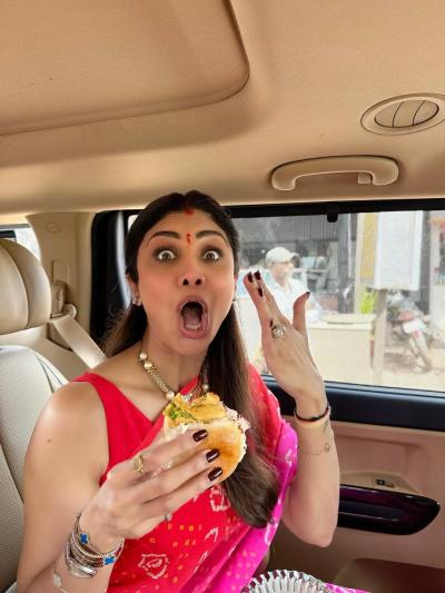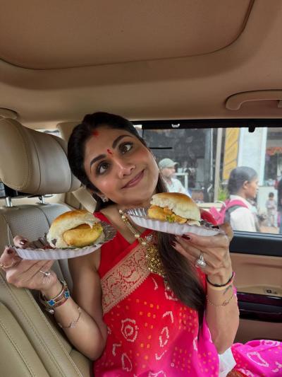 शिल्पा शेट्टीनं वडापाव खातानाचा फोटो शेअर केले आहेत, ज्यातून ती चाहत्यांना आपल्यातलीच एक वाटतेय.