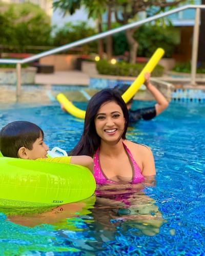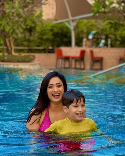 स्विमिंग पूलमध्ये श्वेता मुलांसोबत मजामस्ती करताना दिसली.