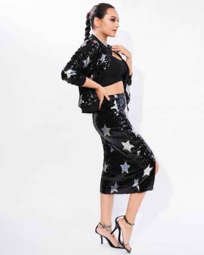 या फोटोंमध्ये सोनाक्षी सिन्हा काळ्या रंगाच्या शिमरी जॅकेट आणि स्लिट स्कर्टमध्ये दिसत आहे. (फोटो: इंस्टाग्राम)