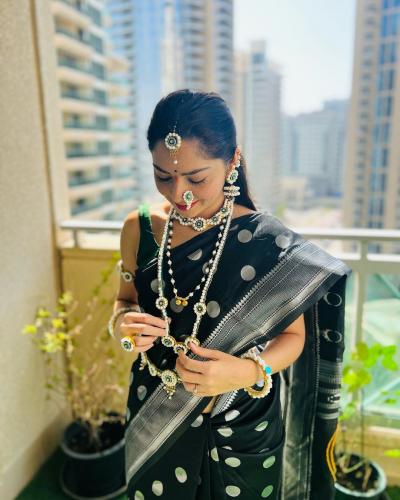 सोनाली कुलकर्णीचे हलव्याचे दागिन्यात आणि काळ्या रंगाच्या साडीत सुंदर दिसते आहे.