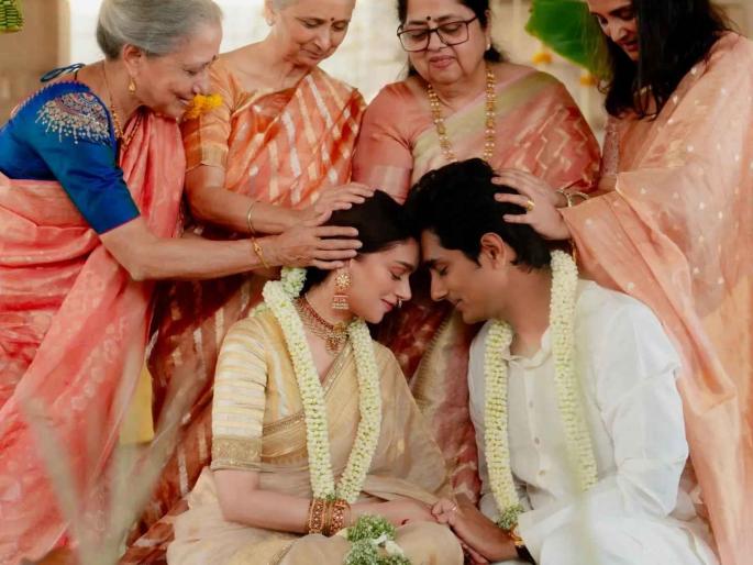 1 / 7अदिती आणि सिद्धार्थ दाक्षिणात्य पारंपरिक पद्धतीत लग्नबंधनात अडकले. कुटुंबाच्या साक्षीने त्यांनी सातफेरे घेतले. हे फोटो त्यांच्या पुढील प्रवासाची साक्ष देत आहेत.2 / 7सिनेसृष्टीतील गेल्या काही दिवसांपासून सर्वात चर्चेत असलेली जोडी म्हणजे अदिती राव हैदरी (Aditi Rao Hydari) आणि सिद्धार्थ (Siddharth). दोघंही नुकतेच लग्नबंधनात अडकले आहेत. अदितीने फोटो शेअर करत चाहत्यांना ही गुडन्यूज दिली.3 / 7गोल्डन रंगाची नेटची साडी, त्याच रंगाचा ब्लाऊज, सोन्याचे दागिने आणि केसात गजरा असा या लूकमध्ये अदिती नटली आहे. नवरीच्या या रुपावर सिद्धार्थही फिदा झालेला दिसत आहे.4 / 7अग्नीच्या साक्षीने आणि जवळच्या लोकांच्या उपस्थितीत त्यांनी लग्नाचे विधी पूर्ण केले. आयुष्यभर एकमेकांची साथ देण्याचं वचन देत त्यांनी एकमेकांच्या गळ्यात हार घातला. 5 / 7साऊथमधील १०० वर्ष जुन्या प्रसिद्ध मंदिरात ते लग्नबंधनात अडकल्याचं दिसत आहे. त्यांचं हे फोटोशूटही खूपच खास आहे. साधं पण तितकंच क्लासिक असं हे फोटोशूट आहे. 6 / 7लग्नानंतर दोघांनी एकमेकांना मारलेली मिठी खरोखर मॅजिकल आहे. 'तूच माझा सूर्य, तूच चंद्र आणि सगळे तारे.. अनंतकाळासाठी आपण एकमेकांचे झालो आहोत.. असंच हसत राहू कधीच मोठे व्हायला नको...कायम प्रेम, प्रकाश आणि जादू...मिसेस अँड मिस्टर अदू-सिद्धू.' असं कॅप्शन अदितीने दिलं आहे.7 / 7इंडस्ट्रीतील कलाकार आणि चाहत्यांनी त्यांच्यावर शुभेच्छांचा वर्षाव केला आहे. चार महिन्यांपूर्वीच त्यांनी गुपचूप साखरपुडा केला होता. आता दोघंही आयुष्यभरासाठी एकत्र आले आहेत.