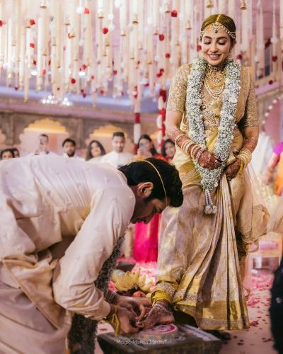 तिरुवनमीयूर येथे पारंपारिक दक्षिणात्य पद्धतीने हा विवाहसोहळा पार पडला.