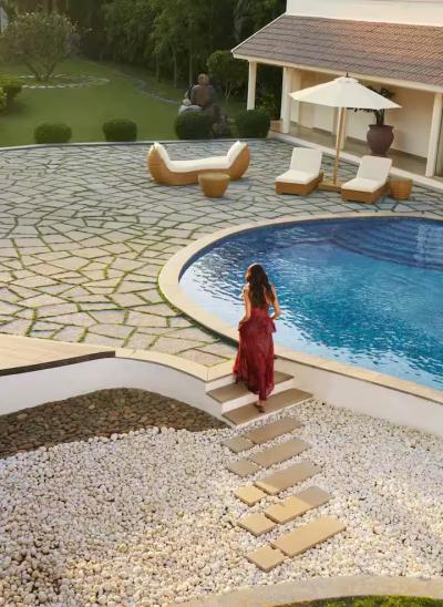 एक महागडा स्विमिंग पूल आहे. एकूणच हा एक हवेशीर सेटअप आहे आणि रिलॅक्स होण्यासाठी तसंच मोकळ्या हवेत सूर्यास्त पाहण्यासाठी एक सुंदर जागा आहे.