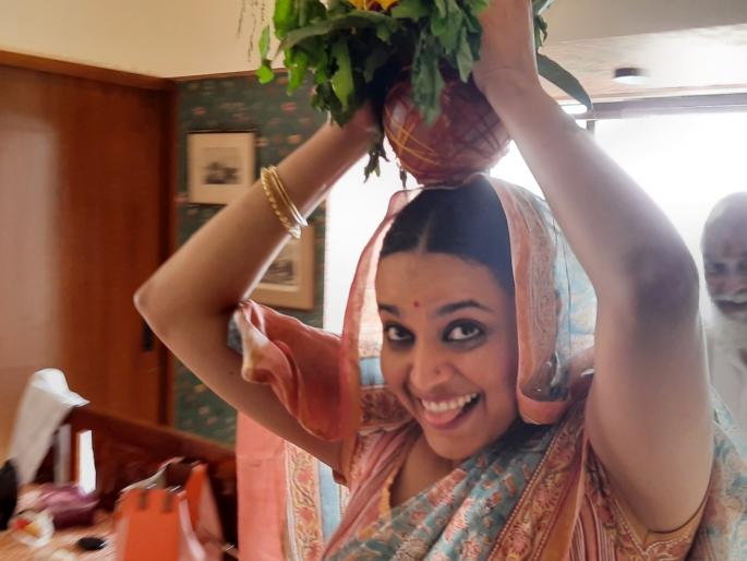 स्वरा भास्करने फोटो शेअर केले आहेत. ज्यात ती हिंदू रिती रिवाजात गृह प्रवेश करताना दिसते आहे.