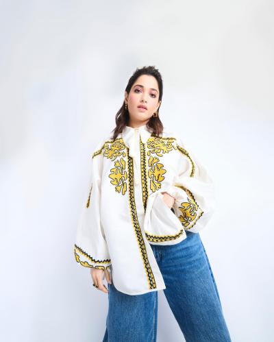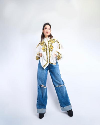 या फोटोंमध्ये तमन्नाने गोल्डन एम्ब्रॉयडरी असलेला पांढरा शर्ट आणि ब्लू डेनिम जीन्स घातलेली दिसत आहे. (फोटो: इंस्टाग्राम)