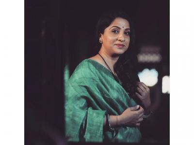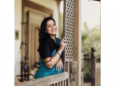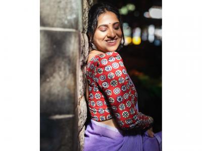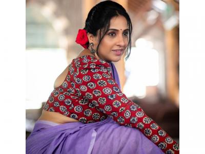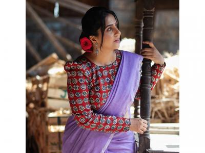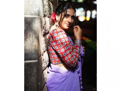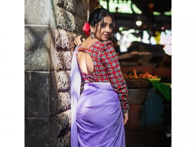 मधुराणीने जांभळ्या रंगाची साडी आणि लांब बाह्यांच्या प्रिंटेड ब्लाऊजमध्ये फोटोशूट केलं आहे.