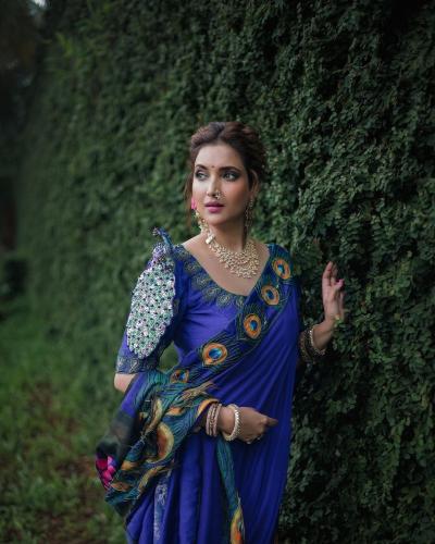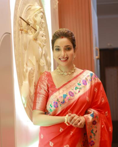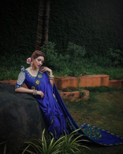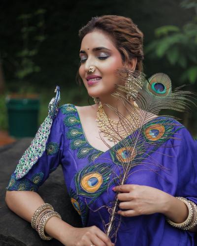 खास मोराचं नक्षीकाम असलेला ब्लाऊज रुपालीने घातला आहे. मोराचं पीस घेत रुपालीने फोटोसाठी पोझ दिली आहे.