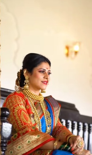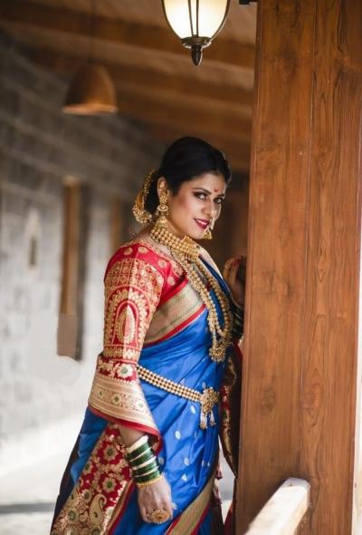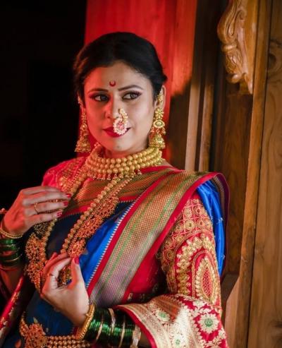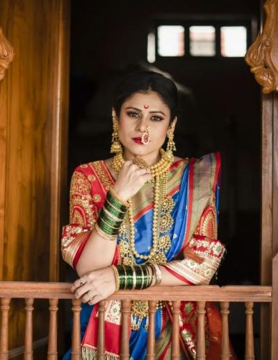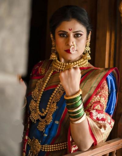 या फोटोत अश्विनीने निळ्या रंगाच्या नऊवारी साडीवर कपाळावर चंद्रकोर, नाकात नथ, सोनेरी सर आणि ठुशी परिधान केलेली दिसते आहे.