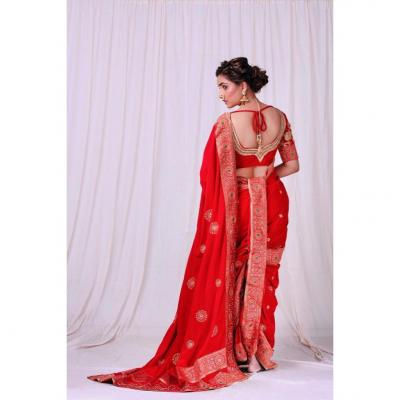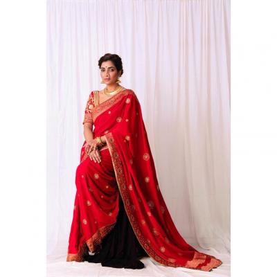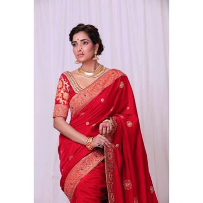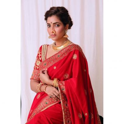 लाल साडीत नाकात नथ, कानात झुमके आणि नेकलेसने तिच्या सौंदर्याला चारचाँद लावले आहेत.