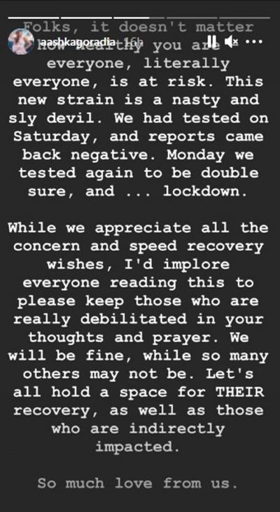 आशकाने सांगितले की, आम्ही शारिरीक रित्या खूप चांगले वाटत आहे, मात्र टेस्टचा रिपोर्ट पाहून सध्या आम्हाला व्हायरसला दूर पळवायचे आहे.