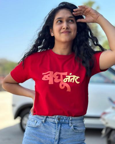 प्रियदर्शनी इंदलकरच्या टीशर्टवर weनम्र आणि बघू नंतर असं कॅप्शन लिहीलेलं दिसतंय