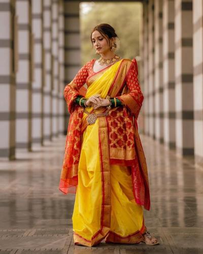 पिवळी नऊवारी साडी, हातात हिरवा चुडा, नकात नथ आणि केसात माळलेला गजरा अंकिता लग्नात टीपिकल महाराष्ट्रीयन नववधू बनलेली दिसेतय. (Photo Instagram)