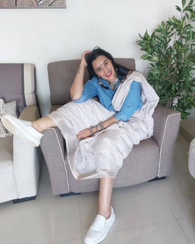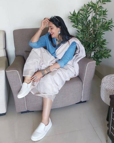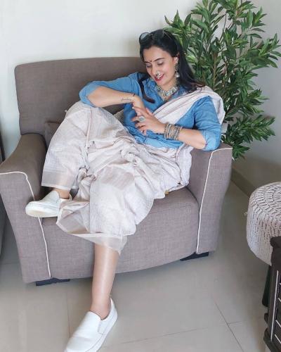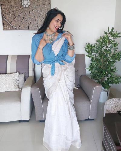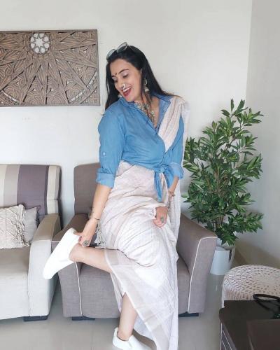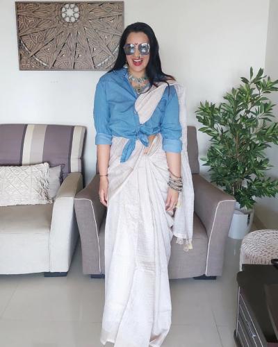 निळ्या रंगाची डेनिम शर्ट अन् पांढऱ्या रंगाची साडी, पायात व्हाईट शूज अशा हटके अंदाजातील तिच्या या फोटोंनी अनेकांचं लक्ष वेधलं.