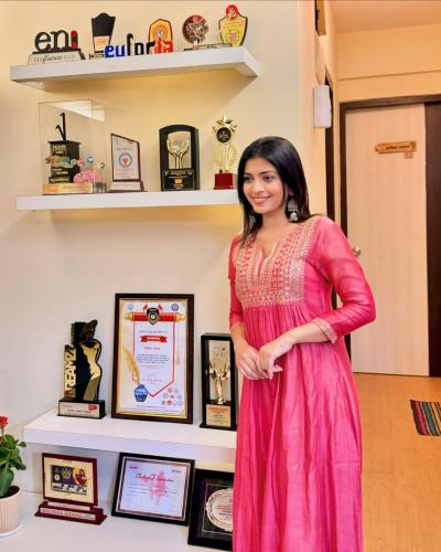 घराचा एक कोपरा रुचिराने तिच्या ट्रॉफी ठेवून सजवला आहे.