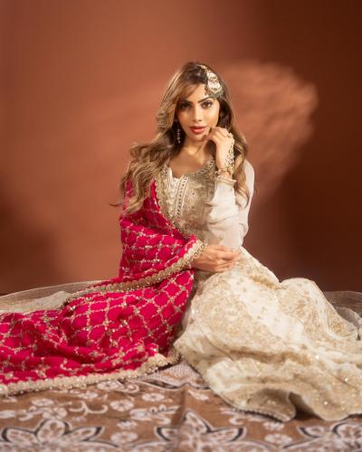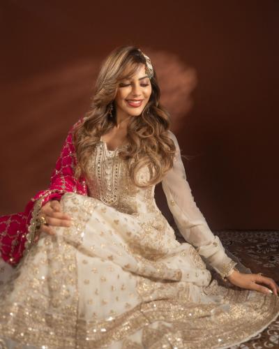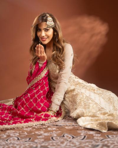 या फोटोशूटमध्ये निक्की तांबोळीने पांढऱ्या रंगाचा अनारकली ड्रेस आणि त्यावर गुलाबी रंगाची ओढणी घेतली आहे.
