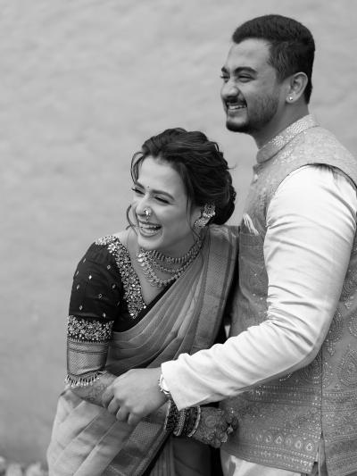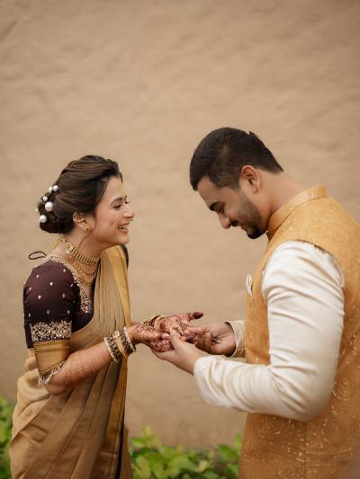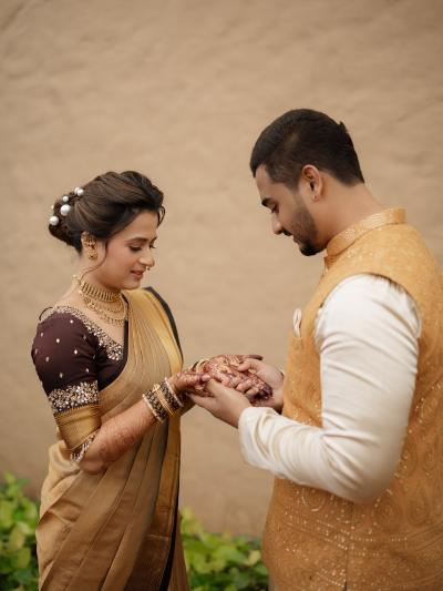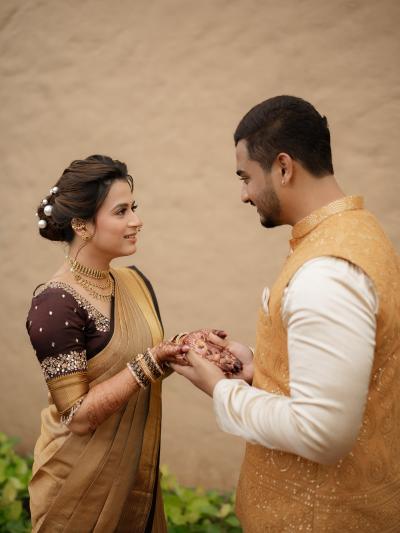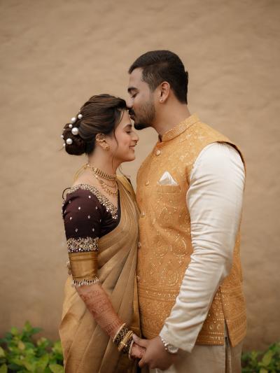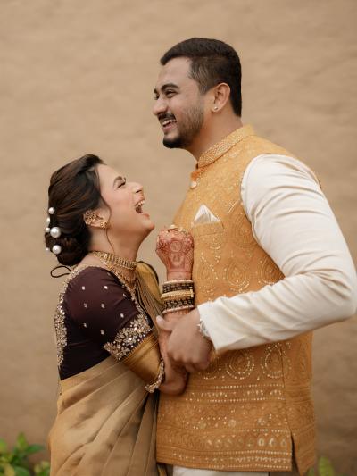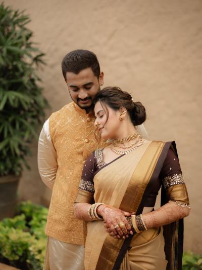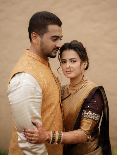 यात प्राजक्ताने गोल्डन रंगाची साडी आणि त्यावर ब्राउन रंगाचा नक्षीकाम असलेला ब्लाउज परिधान केला आहे. तिला मॅचिंग करत शंभुराजने ऑफव्हाइट रंगाचा कुर्ता त्यावर गोल्डन जॅकेट असलेली शेरवानी घातली आहे.