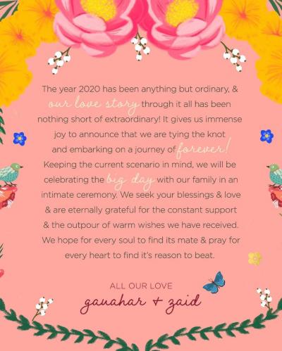 गौहरने एक छानसा फोटो पोस्ट शेअर करत सांगितले की ती जैद दरबारसोबत नवीन आयुष्याला सुरूवात करणार आहे. त्याची अनाउंसमेंट तिने खास अंदाजात केली आहे. (फोटो: इंस्टाग्राम)