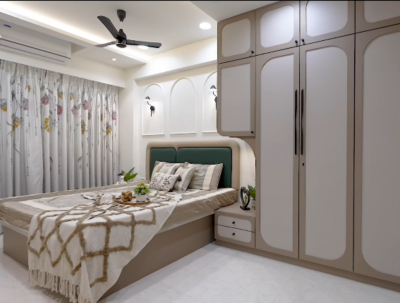 मास्टर बेडरूममध्ये भिंती आणि फर्निचरसाठी लाकडी व फिकट तपकिरी रंगांचा वापर केला आहे, ज्यामुळे रूम शांत आणि सुंदर दिसते.