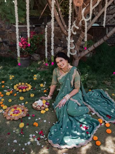 गौतमीने या फोटोशूटसाठी निवडलेली साडी जितकी सुंदर आहे, तितकाच तिचा ब्लाऊजही लक्षवेधी आहे. हाताने नक्षीकाम केलेल्या 'आरी वर्क' मुळे तिच्या ब्लाऊजला एक रॉयल लूक मिळाला आहे.