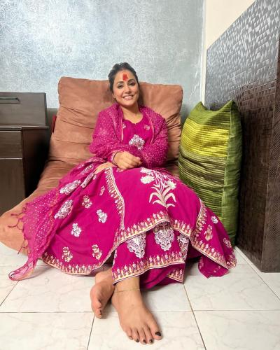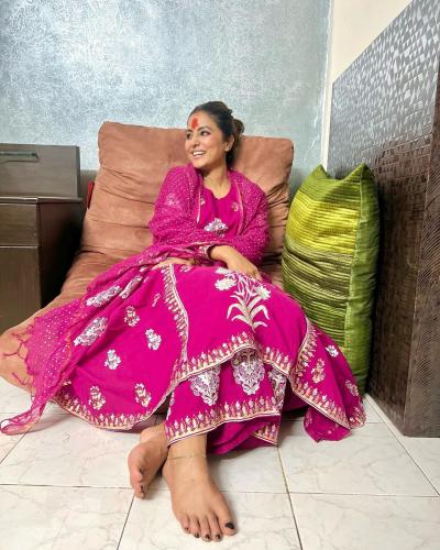 हिनाने मजेंटा रंगाचा अनारकली सूट घालून सोफ्यावर बसलेली दिसत आहे. (फोटो: इंस्टाग्राम)