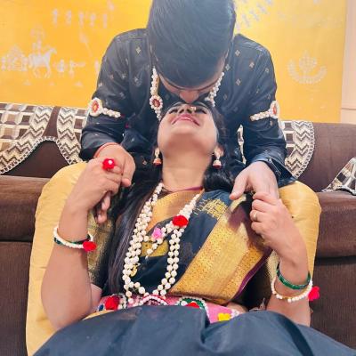 यावेळी तिने काळ्या रंगाच्या साडीसोबत हलव्याचे दागिनेदेखील घातले होते. तिच्यासोबत धवलने देखील काळ्या रंगाचा कुर्ता आणि हलव्याचे दागिने घातलेले पाहायला मिळाले.