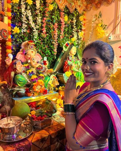 सायली कांबळेनं लग्नानंतरचा पहिला सण म्हणजे गणेशोत्सव साजरा करते आहे. त्याचे फोटो ती सोशल मीडियावर शेअर करत आहे.