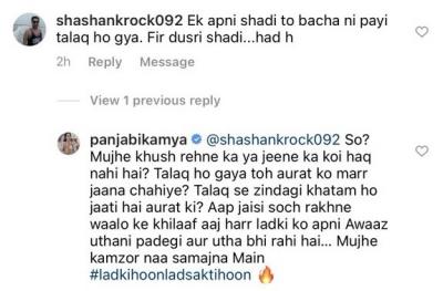 काम्या पंजाबीने महिला सक्षमीकरणावर एक व्हिडिओ पोस्ट केला. या पोस्टवर एका यूजरने कमेंट केली आहे की, "स्वत:चं लग्न तर वाचवू शकली नाही, घटस्फोट झाला, मग दुसरे लग्न,.यावर काम्याने उत्तर दिले आणि लिहिले, "मग? मला आनंदी राहण्याचा किंवा जगण्याचा अधिकार नाही? घटस्फोट झाला तर बाईने जीव द्यावा का? घटस्फोटाने महिलेचे आयुष्य संपते? जे तुमच्यासारखे विचार करतात त्यांच्या विरोधात. प्रत्येक मुलीला लढावं लागले. .मला कमजोर नको समजू, मी एक मुलगी आहे आणि मी लढू शकते.(Photo Instagram)