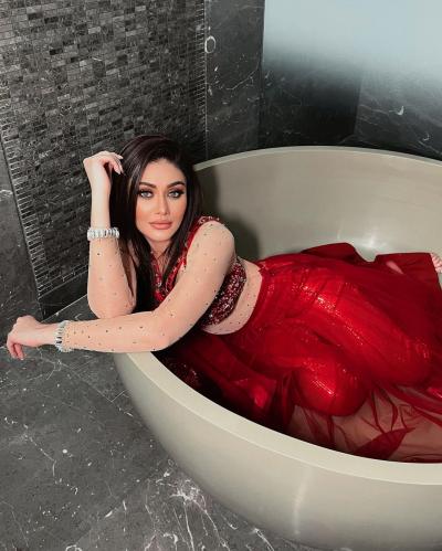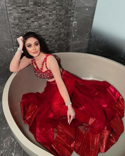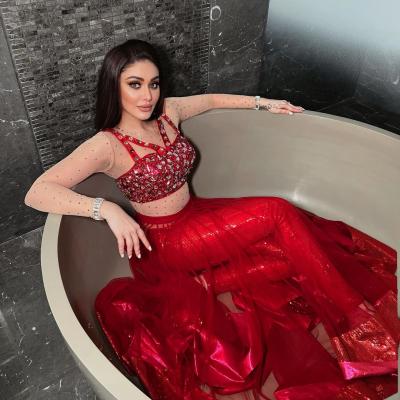 या फोटोंमध्ये शेफालीने लाल रंगाचा सिक्वेन्स लेहेंगा घालून बाथटबमध्ये बसून फोटोशूट केले आहे. (फोटो: इंस्टाग्राम)