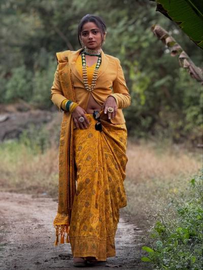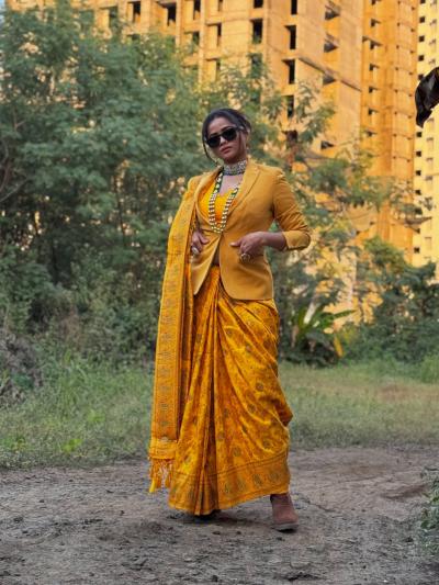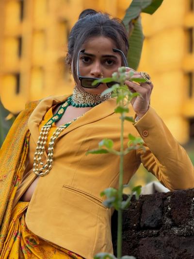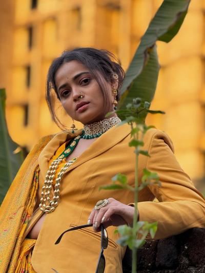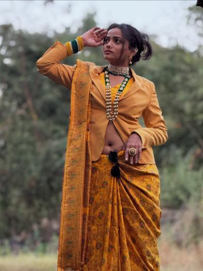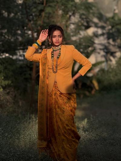 शिवालीने पिवळ्या रंगाची साडी, ब्लाऊज आणि त्यावर ब्लेझर असा हटके लूक केल्याचं दिसत आहे. चोकर आणि लाँग नेकलेस अशी ज्वेलरी तिने घातली आहे.