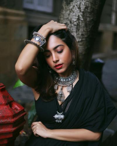 फोटोशूटसाठी सखीने खास काळ्या रंगाची साडी नेसल्याचं दिसत आहे. त्यावर मॅचिंग स्लीव्हलेस ब्लाऊजने सखीने फॅशन केली आहे. केस मोकळे सोडत सखीने कातिल लूक केला आहे.