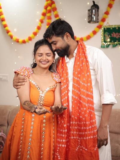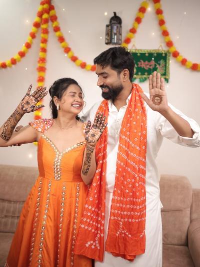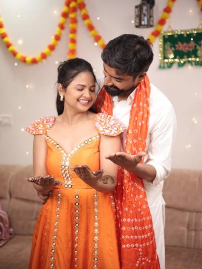 अपूर्वानं आपल्या मेंहदीत तिने नारिंगी रंगाचा अतिशय मोहक ड्रेस परिधान केला होता. तर अंशुमनने तिला मॅचिंग असा लूक केला होता.