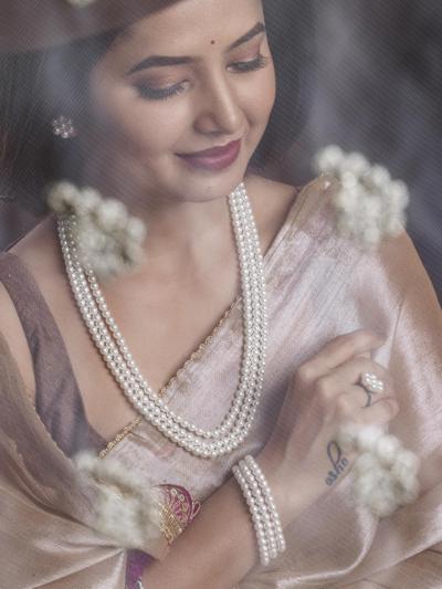 या फोटोंमध्ये प्राजक्ताने साडी नेसत त्यावर मोत्याचे दागिने घातले आहेत.