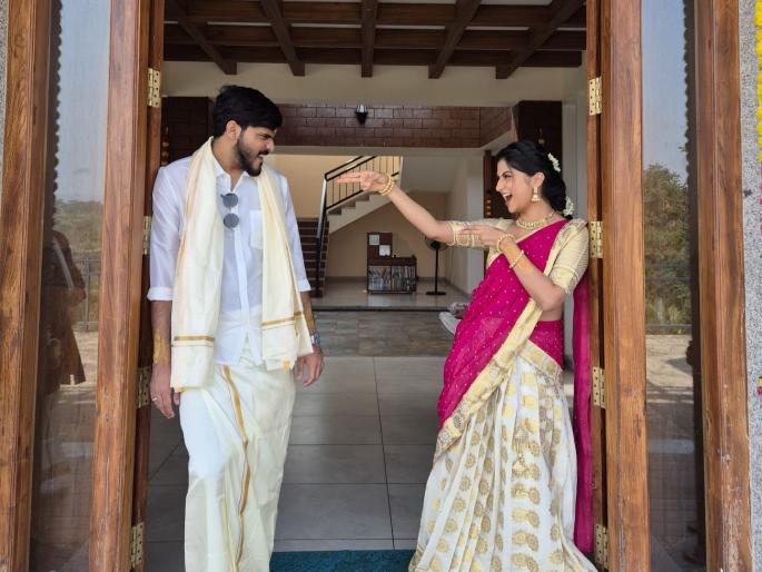 रसिका वाखारकर गुलाबी आणि पांढरी किनार असलेली साडी परिधान केली आहे. तर तिच्या नवऱ्याने पांढरा शर्ट, लुंगी आणि खांद्यावर उपरणं असा साउथ इंडियन अंदाज परिधान केला आहे.