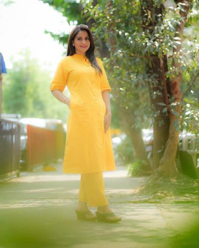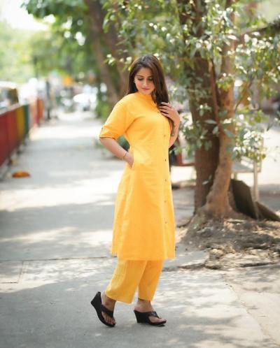 पिवळ्या रंगाचा कॉटन ड्रेस परिधान करत नम्रताने काही फोटोज क्लिक केलेत.