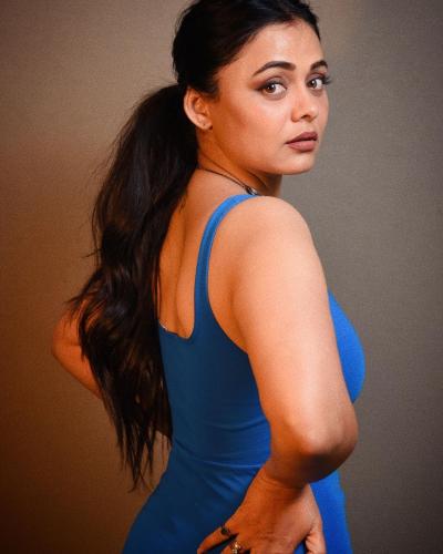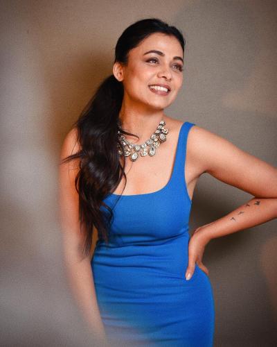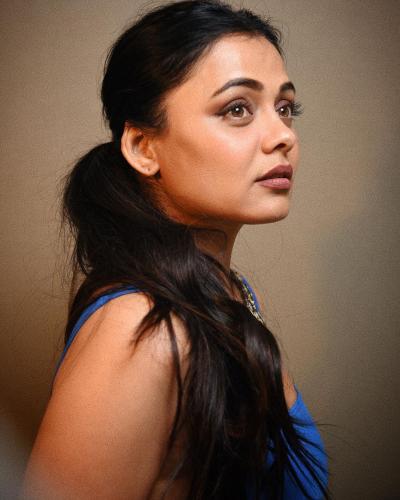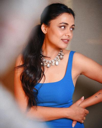 प्रार्थनाने निळ्या ड्रेसवर गळ्यात नेकलेस घातला आहे आणि केस बांधलेले आहेत.