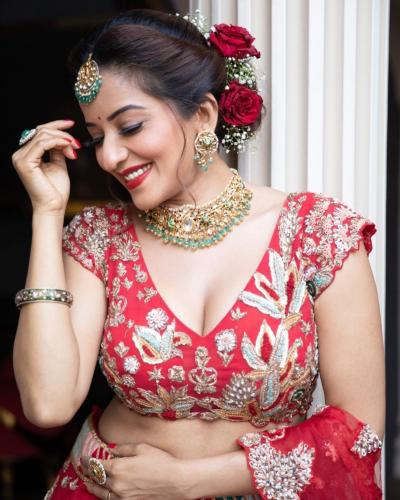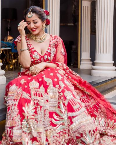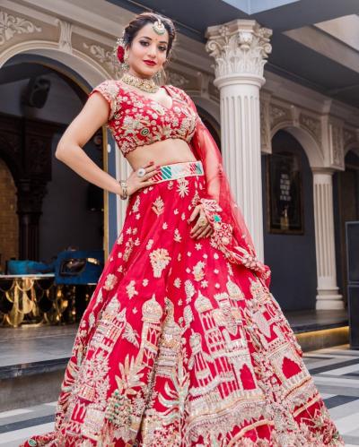 मोनालिसाचे सौंदर्य लाल रंगाच्या लहेंगामध्ये चांगलेच खुलून आले आहे. (फोटो: इंस्टाग्राम)
