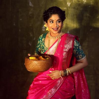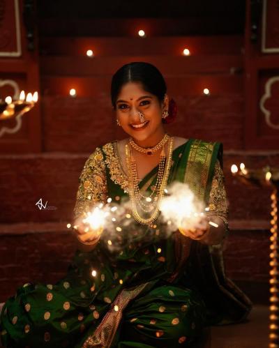 धनत्रयोदशीच्या दिवशी समृद्धीने हिरव्या रंगाची पैठणी साडी नेसून हटके अंदाजात फोटो क्लिक केले आहेत.