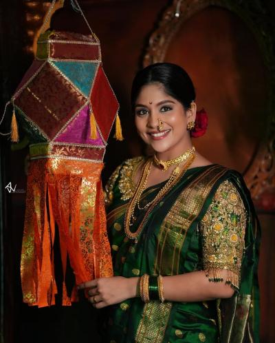 हिरवी नऊवारी साडी त्यावर साजेसे दागिने अशा पारंपरिक पेहरवात अभिनेत्री पाहायला मिळते आहे.