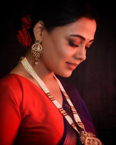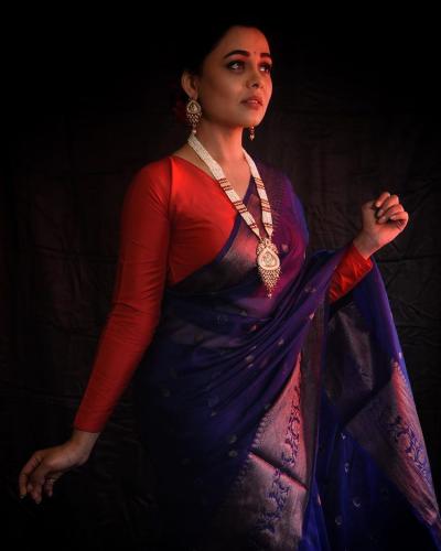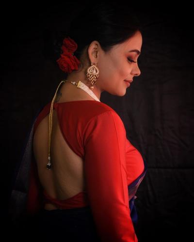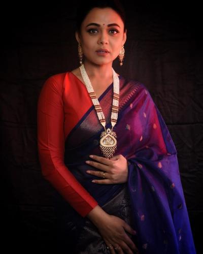 या फोटोमध्ये प्रार्थनाने लाल रंगाचं लाँग सिल्व्हज ब्लाऊज आणि जांभळ्या रंगाची साडी नेसली आहे.