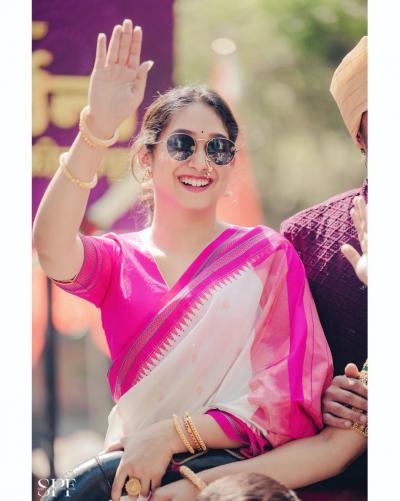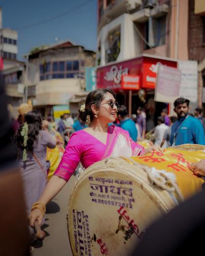 प्रियदर्शनीने गुलाबी साडी नेसून केसात गजरा माळून खास ढोलवादन केलेलं दिसलं