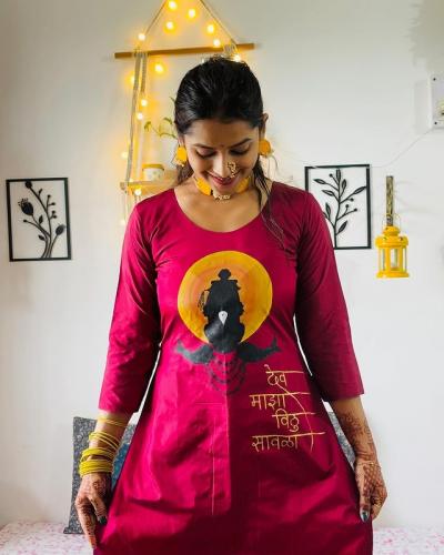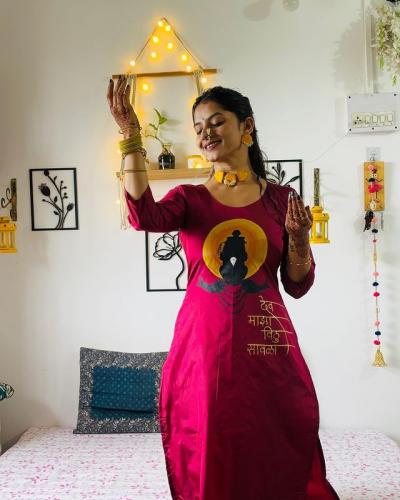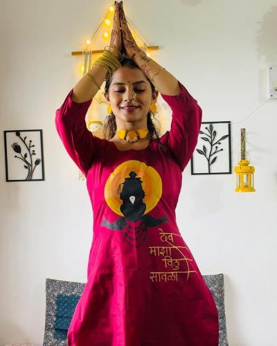 गुलाबी रंगाचा कुर्ता त्यावर विठुरायाची सुंदर प्रतिकृती असा पेहराव तिने या दिवशी केला आहे.