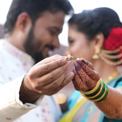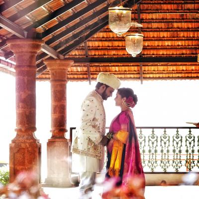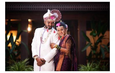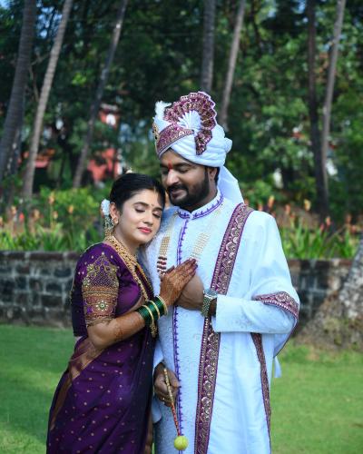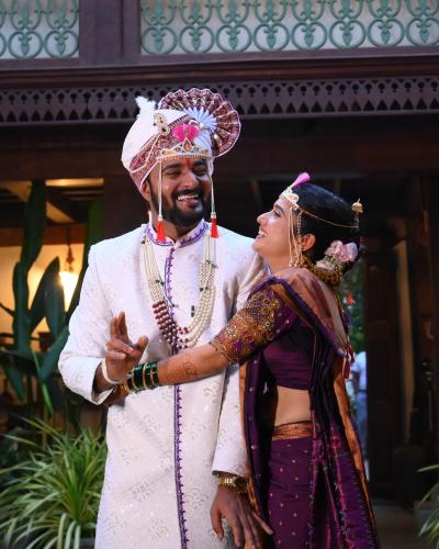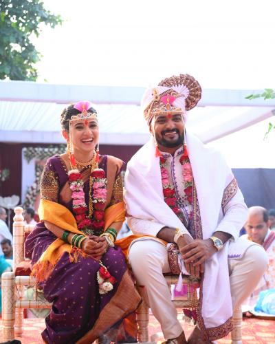 वैष्णवीने लग्नासाठी जांभळ्या रंगाची नववारी नेसली होती तर किरण पांढऱ्या रंगाची शेरवानी परिधान केली होती.