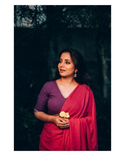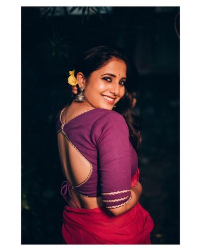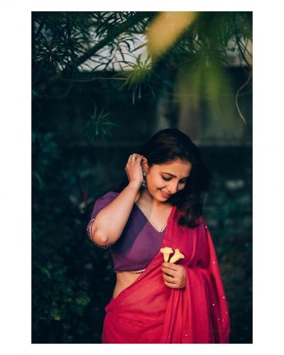जांभळ्या रंगाचा खणाचा ब्लाऊज आणि गुलाबी रंगाची साडी, झुमके यामध्ये ती खूपच सुंदर दिसत आहे. केस मोकळे सोडले असून एका फोटोत कानामागे छानसे फूल लावले आहे.